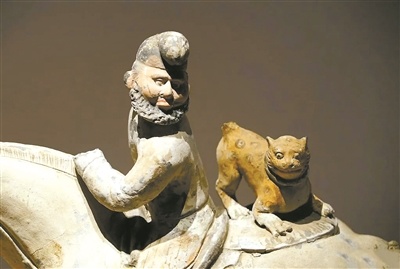 猞猁用于狩猎,据说率先是在古印度孔雀王朝时期,由古印度的君主们实验得手,而在中国唐代的壁画和陶俑中,也出现了狩猎时将猞猁放弃在马鞍上的造型,固然使用猞猁狩猎具体什么时候在中国出现还未可知,但是至少在唐代,由于那时西域列国纷纷向唐朝皇室纳贡猞猁,使得这种狩猎神态在表层社会流行开来。是以这件陶俑相配越过地反应了丝绸之路换取和中西文化换取。