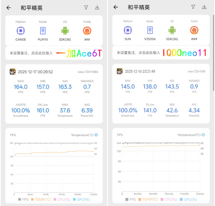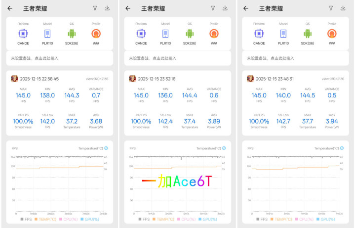 再看一加Ace6T,通常144帧款式,平均帧率比iQOONeo11略高少量,波动更小,何况温度扫尾更优秀——最高才37.7℃,摸入部属手感特别惬意,功耗也只到3.94W,属于“又稳又凉快”的类型。