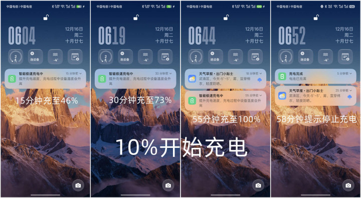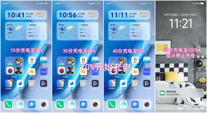 我们顺利看充电实测:从10%运转充,一加Ace6T15分钟充到46%、30分钟到73%,55分钟就满了;iQOONeo1115分钟才到38%、30分钟66%,45分钟到95%,最终用了53分钟充满。