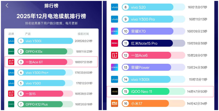 续航我们顺利看续航榜单就好了,一加Ace6T排进前三,续航时刻干到18小时07分。iQOONeo11排第15,续航14小时47分,差了快3个半小时。实质用起来即是:Ace6T重度用一天(刷视频+打几局游戏),睡前还有电;Neo11可能下昼就得找充电器,续航差距是真的领路,Ace6T在这一项顺利如实不俗。