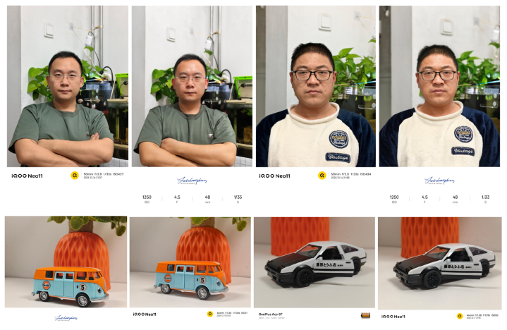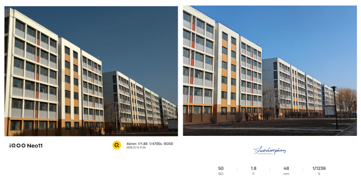 拍照这块,一加Ace6T搭载的是索尼IMX906,传感器尺寸1/1.56英寸,iQOONeo11搭的是LYT700V,传感器尺寸1/1.56英寸,平日拍照成像相反不大。算法上各有认真,一加Ace6T搭载OPPO旗舰影像算法,iQOONeo11则是蓝厂同款算法。