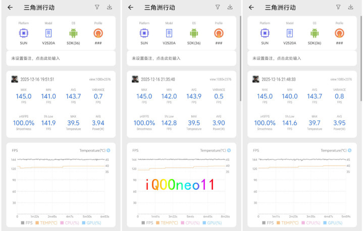 《三角洲行动》是维持165帧比较早的游戏,先看iQOONeo11,开144帧款式后,平均帧率稳在143.7掌握,波动特别小,全程畅达度拉满。机身温度最高39.7℃,摸入部属手感偏温。