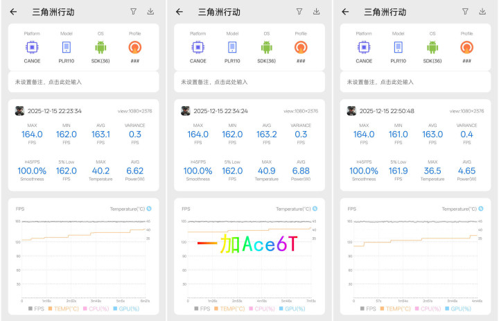 再看一加Ace6T,顺利干到164帧满帧,平均163帧险阻,波动小,枪战时画面丝滑没拖影。不外温度稍高少量,最高40.9℃,这温度也不算高,属于可以罗致的范围内。