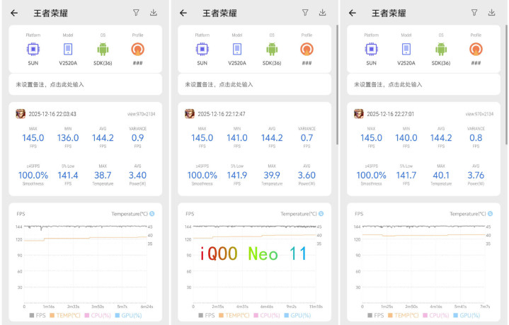 我们接着聊《王者荣耀》的实质体验:先看iQOONeo11,开144帧后平均稳在144.2帧,波动很小,团战、妙技殊效堆满时也没掉帧,畅达度顺利拉满。温度冉冉涨到40.1℃,属于“有点温但不烫”的经由,功耗也就3.76W,玩几局下来耗电也不猛。