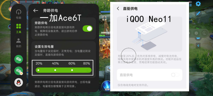 除了游戏助手,一加Ace6T的旁路供电对比iQOONeo11的直驱供电要更实用少量,二者比较可诞生顺利电量这一块更具实用性。